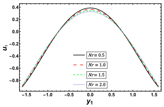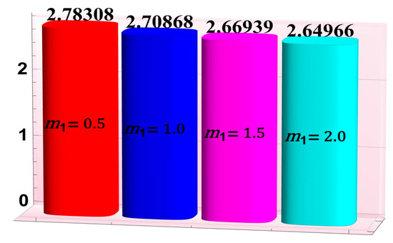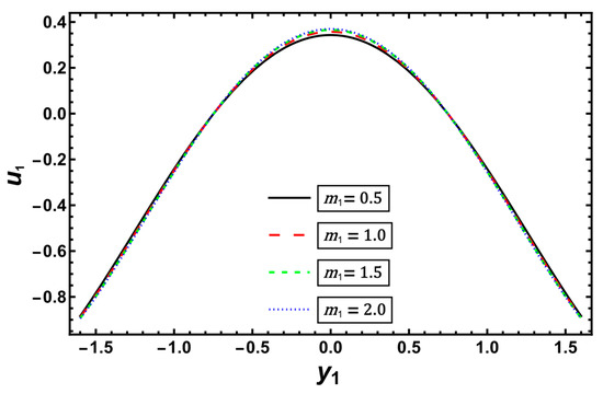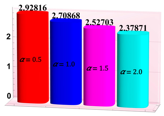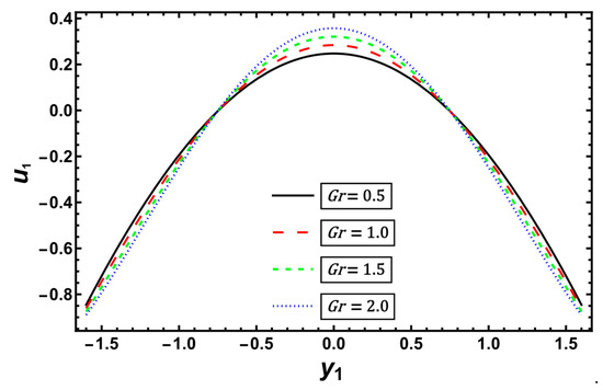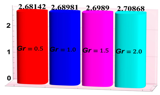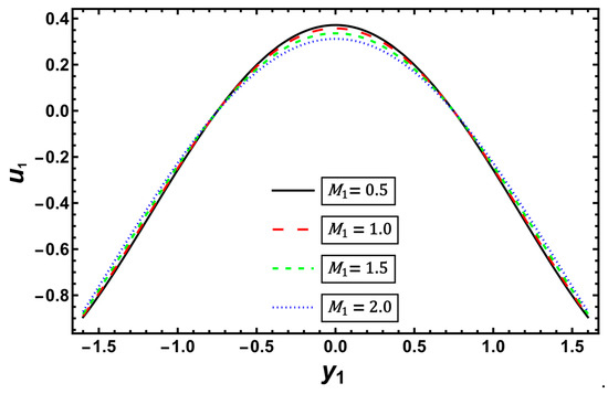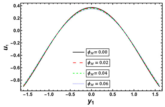 Figure 6 displays that as the parameter increases, there is a drop in the fluid velocity of nanoparticles at the middle point, but an improvement in velocity near the walls. This can be attributed to the acceleration of the Lorentz force caused by the increased magnetic field strength, leading to greater resistance encountered by the fluid particles, and thus, reducing the fluid velocity. Figure 7 displays the relationship between “” and “”. The velocity adjacent to the central part of the conduit is observed to increase with larger values of the Grashof number, as shown in the figure. Figure 8 represents that axial velocity is boosted in the center of the wall when is increased. Figure 9 clearly shows that as the Hartmann number increases, there is a growth in the velocity adjacent to the walls, while near the central point, a decreasing trend is observed. The effects of and ‘’ on fluid velocity are demonstrated in Figure 10 and Figure 11, respectively. It is noticed from these figures that both nanoparticles volume friction parameters significantly decrease the hybrid nanofluid velocity distribution in the middle of the walls.