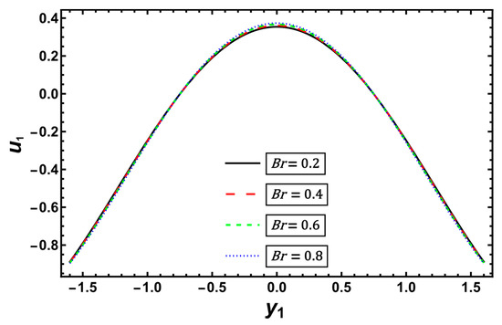 Figure 4, Figure 5, Figure 6, Figure 7, Figure 8, Figure 9, Figure 10 and Figure 11 relate the impact of the Brinkman number , the velocity slip parameter , the Hartman number , MWCNT nanoparticle volume friction , nanoparticle volume friction , the Hall parameter , the Grashof number , and the thermal radiation parameter on velocity distribution. Figure 4 illustrates that as the value of ““ rises, there is an improvement in the velocity profile due to the reduction in electrical conductivity production, which results in a decrease in the damping of the magnetic force. Figure 5 depicts the impact of the velocity slip parameter on the velocity distribution, revealing a reduction at the center in the fluid velocity, while the opposite behavior is noticed in both walls for the higher values of . This pattern can be justified by the point that increasing the slip parameter reduces the interaction of the fluid and the walls, which results in a weaker velocity gradient across the channel. As a result, the middle point velocity declines as the slip parameter grows.