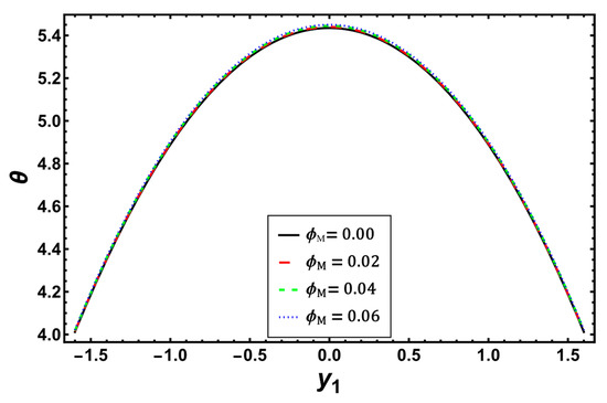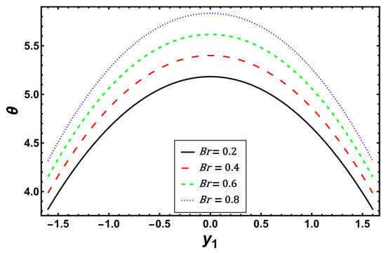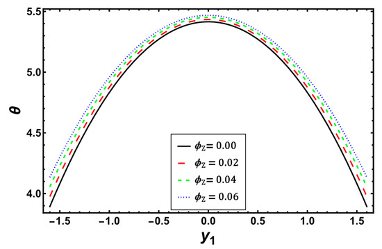 Figure 12, Figure 13, Figure 14, Figure 15, Figure 16, Figure 17, Figure 18 and Figure 19 relate to the impact of the Brinkman number , the temperature-dependent thermal conductivity parameter , the Hartman number , the Grashof number , the heat source/sink parameter , the Hall parameter , the Biot number , the thermal radiation parameter , MWCNT nanoparticle volume friction , and nanoparticle volume friction on temperature distribution. Figure 12 shows that an increase in the magnitude of temperature distribution is observed for higher values of the Brinkman number. Physically, this can be attributed to the nanofluid being heated up due to friction in the fluid layers, resulting in an improvement in the fluid temperature as the Brinkman number increases. Moreover, this is because a higher viscosity tends to suppress turbulence and promote thermal mixing, which leads to a more efficient transfer of heat between different regions of the fluid. Thus, an enhancement in the Brinkman number generally results in a higher temperature profile in the fluid. Similarly, an increasing behavior in the magnitude of temperature distribution is noted for the higher heat source parameter in Figure 13. Increasing the thermal conductivity of a fluid can enhance its ability to dissipate or absorb heat, leading to a decrease in the temperature of the hybrid nanofluid above the boundary for higher values of the temperature-dependent thermal conductivity parameter, as depicted in Figure 14. Figure 15 indicates that the temperature profile improves with an improvement in the Hartmann number, mainly due to Ohmic heating. This means that the fluid becomes hotter as the Hartmann number increases. This behavior can be explained by the fact that the magnetic field induces an electric current in the fluid, which leads to Ohmic heating. As the Hartmann number increases, the strength of the magnetic field increases, which in turn increases the electric current and the amount of heat generated by Ohmic heating. This leads to a higher temperature profile in the fluid.
