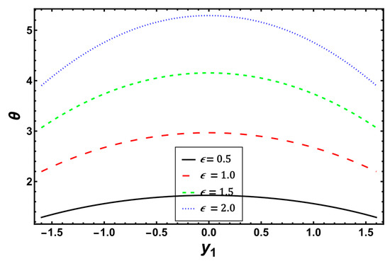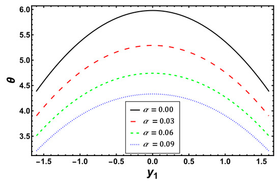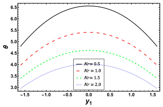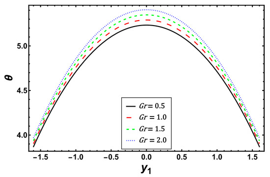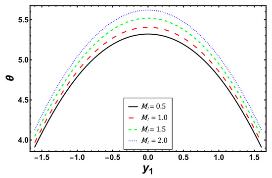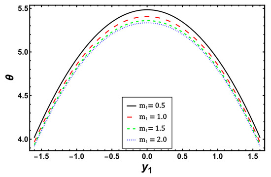 The impact of the Grashof number on the temperature variation of the hybrid nanofluids is demonstrated in Figure 16, indicating that an increase in results in an increase in fluid temperature. Figure 17 illustrates the effect of the Hall parameter on temperature distribution, showing that higher values of the Hall parameter lead to a significant reduction in the temperature of the hybrid nanofluid. This is attributed to the presence of greater Hall currents, which lessens the influence of the bulk magnetic force and subsequently decreases the temperature distribution. Furthermore, Figure 18 demonstrates the influence of the Biot number on fluid temperature and reveals a decreasing trend. The observed behavior can be attributed to the heat transfer process occurring between the fluid and the solid surface. During flow over a solid surface, heat transfer takes place from the solid to the fluid as a result of the temperature difference between them. The rate of heat transfer is determined by the Biot number, which represents the relative contribution of internal and external thermal resistance. A large Biot number indicates that the internal thermal resistance of the solid is significantly higher than the external thermal resistance, resulting in a limited heat transfer rate primarily determined by the internal resistance of the solid. This, in turn, causes the fluid temperature to remain relatively constant or decrease. Figure 19 shows that the fluid temperature drops for higher values of thermal radiation parameter Figure 20 and Figure 21 demonstrate that raising the values of and leads to an increase in the temperature profile.
