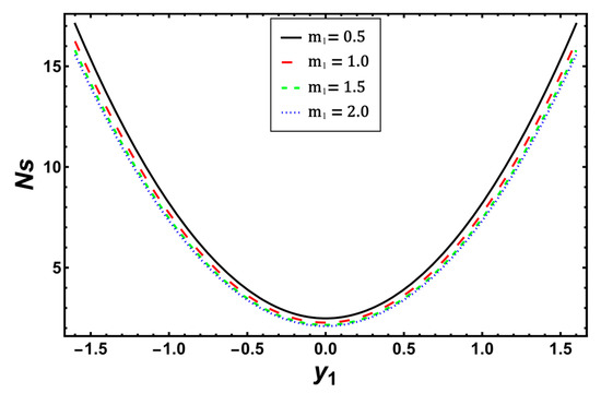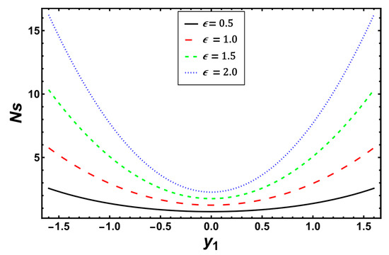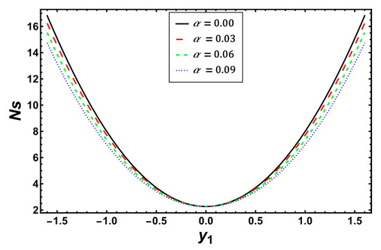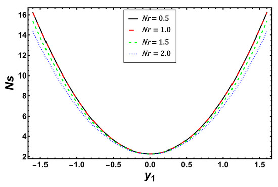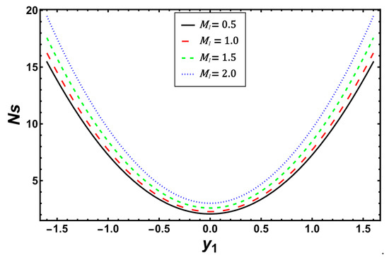 Figure 22, Figure 23, Figure 24, Figure 25 and Figure 26 demonstrate how various flow parameters affect entropy generation. Evidently, the entropy generation distribution decreases near the channel walls by increasing the thermal conductivity parameter and shows a lowest value in the middle of the channel, as observed in Figure 22. This is because the increased thermal conductivity allows more efficient transfer of heat away from the fluid near the walls, reducing the quantity of entropy generated in that region. Additionally, the minimum value of entropy in the middle of the channel is due to factors such as lower fluid velocity or temperature in that region, or a more efficient transfer of heat away from the fluid due to the geometry of the channel. Figure 23 describes the change in Hartman number on the entropy profile. It is observed from Figure 22, Figure 23, Figure 24, Figure 25 and Figure 26 that the entropy distribution of hybrid nanofluid significantly increases with higher values of “”. This phenomenon can be explained by the fact that when Joule heating is present, the temperature of the hybrid nanofluid increases, leading to Ohmic heating. As a result, the nanofluid generates more heat due to the effect of Joule heating, leading to a higher value of the entropy generation number. From Figure 24, it can be observed that entropy distribution lessens near the upper and lower walls by improving the thermal radiation parameter. As the thermal radiation is the transfer of heat by electromagnetic radiation, which occurs due to the temperature difference between two surfaces, therefore, by improving the thermal radiation parameter, it is expected that the heat transfer between the fluid and the walls of the channel becomes more efficient, leading to a decrease in the amount of entropy produced in those regions. In Figure 25, there is an upturn in the entropy generation profile for improving the value of the heat source/sink parameter. This means that whenever more heat is added to the system, the temperature of the system may increase, leading to higher entropy generation due to increased thermal gradients. Additionally, the increased rate of heat addition or removal may lead to more turbulent fluid flow, which could also increase entropy generation.