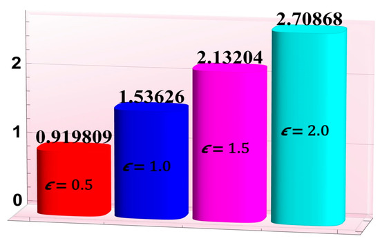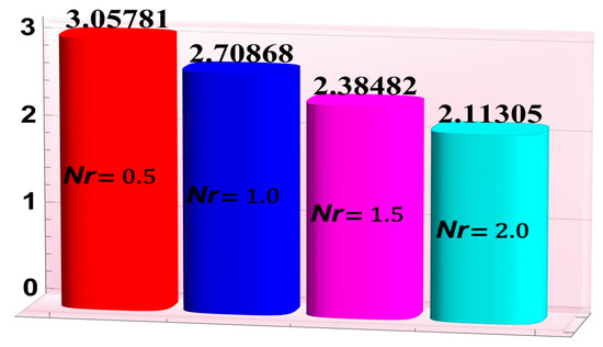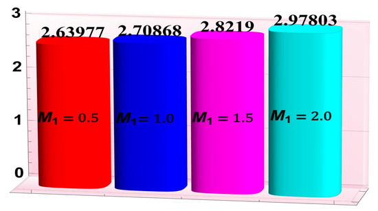 Figure 27, Figure 28, Figure 29, Figure 30, Figure 31, Figure 32, Figure 33 and Figure 34 are presented to investigate the phenomena of the temperature-dependent thermal conductivity parameter , the Grashof number , the heat sink/source parameter , the Hartmann number , the thermal radiation parameter , and the Hall parameter . Notably, the heat transfer rate at the wall for the present study is θ’(h); i.e., the derivative of the temperature at the boundary and its numerical values are given in Figure 27, Figure 28, Figure 29, Figure 30, Figure 31, Figure 32, Figure 33 and Figure 34. Figure 27 shows that increasing “” results in a decrease in heat transfer rates at the boundary. Figure 28 and Figure 29 demonstrate the heat transfer values at the wall by varying the heat source parameter “” and the Hartmann number “”, respectively, and indicate that increasing these parameters improves the rates of heat transfer. Figure 30 shows that increasing the Grashof number results in an increase in heat transfer rates. This reason can be clarified from the mechanism of heat transfer in the fluid flow. When a fluid is heated from below, it becomes less dense and rises due to buoyancy forces. As it rises, it carries heat with it, which is then transferred to the surrounding fluid. This process is known as natural convection. The effects of variations in the Hall and thermal radiation parameters on the heat transfer rates at the wall are depicted in Figure 31 and Figure 32, respectively, and show that the rates of heat transfer decrease for higher values of “” and “”. The behavior of fluid flow can be influenced by magnetic fields and thermal radiation. When a magnetic field is present, the motion of charged particles in the fluid is altered, causing a drop in the velocity of the fluid flow. Consequently, this slower movement leads to a reduction in the rate of heat transfer.