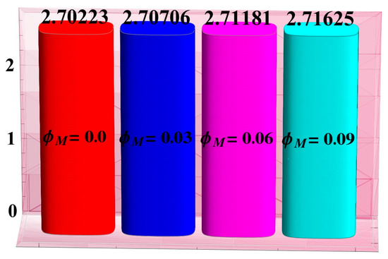 In Figure 33 and Figure 34, it can be seen that rates of heat transfer rise through an increment in hybrid nanoparticles . As the volume fraction of the nanomaterials in the fluid increases, the number of conductive particles in the nanofluid also increases, resulting in an increase in its thermal conductivity. This makes it easier for heat to dissipate throughout the nanofluid, resulting in a drop in the overall heat transfer rate in the wall. The rate at which heat is transferred between a wall and a nanofluid is dependent on the thermal conductivity of the fluid. An increase in the thermal conductivity of the nanofluid causes a decrease in the temperature gradient between the wall and the fluid. This reduction in the temperature gradient leads to a lower rate of heat transfer between the wall and the fluid. As a result, the heat is distributed more uniformly throughout the nanofluid, which can cause a reduction in the rate of heat transfer at the wall.