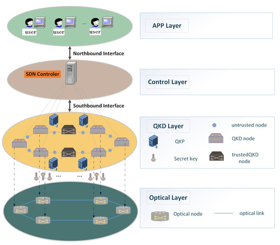 The four layers of the structure collaborate with each other to complete the unconditional secure information encryption transmission. In the APP layer, multiple QKD users randomly send out secret key requests, and each user with specific security requirements requests a certain number of secret keys from the QKD layer. The Software-Defined Network (SDN) controller receives the QKD user’s requests through the northbound interface [27] (restful Application Programming Interface (API) protocol). The user requests with a high secret key demand are prioritized and sent to the QKD layer and optical layer via the southbound interface [28] (open flow protocol). In the QKD layer, three different nodes are required: the QKD nodes, the trusted relay nodes, and the untrusted relay nodes. Secret keys are generated between neighboring QKD nodes and trusted relay nodes or between two neighboring trusted relay nodes. Untrusted relay nodes are third-party nodes. The QKD layer sends the secret keys located in the QKP to the optical layer, which is co-located with the QKD layer. Then, the encryption of the security information requested by a specific user is achieved. Finally, the SDN controller sends the completion command to the application layer.