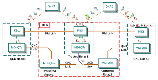 As shown in Figure 2, the trusted relay nodes include the Measurement-Device-Independent-Quantum Transmitters (MDI-QTs), the Key Service (KS), and the Optical Switches (OSs). When the OS and Untrusted Relay 1 are connected, a pair of secret keys is generated between QKD Node 1 and Trusted Relay Node 1, and the generated key pair is temporarily stored in QKP1. When the OS and Untrusted Relay 2 are connected, a pair of secret keys is generated between QKD Node 2 and Trusted Relay Node 1, and the generated secret key pair is temporarily stored in QKP2. For the secret key requirements of more distant node pairs, the staggered deployment of the HTUR is added to the QKD links. Note that only one MDI-QTs device is contained in Trusted Relay Node 1, and we would flexibly utilize the MDI-QTs located in Trusted Relay Node 1 by controlling the OS. The secret keys’ transfer process between the remote QKD Node 1 and QKD Node 2 is as follows: the and located in KS3 conduct the bitwise exclusive OR operation, and ⨁ is sent to KS2 through a key management (KM) link. According to ⨁ ( ⨁ ) = , the KS2 retrieves . Then, both KS1 and KS2 would access . Hence, is shared between QKD Node 1 and QKD Node 2.