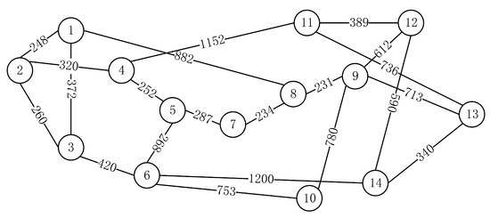 In this section, we introduce the HTUR QKD network with the QKP for cost optimization. To illustrate the efficiency and feasibility of the scheme, we conducted an extensive simulation analysis, with PTR [31] and CO-QBN [13] for comparison. Further, the National Science Foundation Network (NSFNET) and United States Network (USNET) topologies shown in Figure 3 and Figure 4 were adopted for the deployment network cost. QKD requests were randomly generated among all QKD node pairs, and the maximum number of QKD requests satisfied by various QKD networks could be calculated according to the formula . Thus, the maximum number of QKD requests on the NSFNET and USNET is 91 and 276, respectively. We considered the case that there will be more QKD requests in the near future and the existing network users’ scale may need to be further expanded. For the simulation, we assumed that the range of QKD requests on the NSFNET and USNET topologies was [20, 200] and [40, 400], respectively. The weight values of two neighboring nodes on the network topology refer to the physical distance (kilometers). We assumed that there are sufficient wavelengths in the links and there is no case of an insufficient number of wavelengths and request allocation failure. To satisfy the different secret key requirements for the QKD requests, the secret key rate was set as , , and respectively.