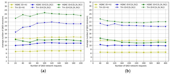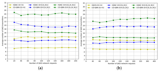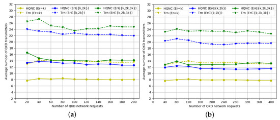 The average number of QKD transmitters required for QKD requests do not show a corresponding linear increase as the QKD requests increase when the secret key rate is , , and , respectively, that is QKD requests are randomly generated among all QKD node pairs. As shown in Figure 5a and Figure 6a, the average number of QKD transmitters/receivers required by the HQNC is smaller than the PTR scheme, which also proves the efficiency of our new proposed method. The advantage of a reduced transmitters/receivers number is especially obvious when the secret key rate is higher. The reason is that the PTR scheme requires more QKD transmitting/receiving devices compared to the HQNC scheme when the secret key rate increases. The number of transmitters/receivers required under the same QKD requests number is slightly larger than the number of receivers. The result is that, adopting the HTUR QKD with the QKP incorporating the MDI-QKD protocol, one more QKD transmitter than QKD receivers is required to complete a QKD request.
