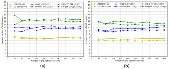 Average QKD receivers number versus QKD requests number compared to CO-QBN based on (a) NSFNET topology and (b) USNET.