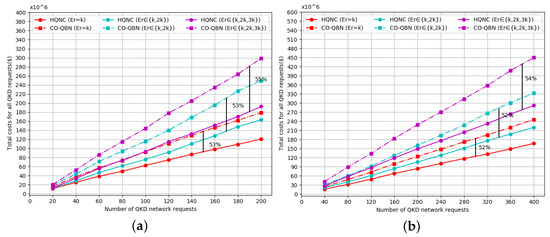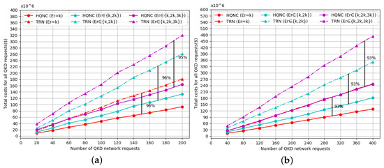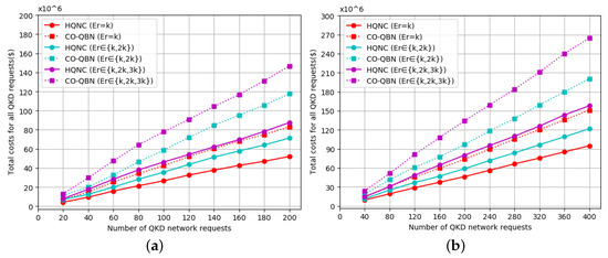 According to Figure 9 and Figure 10, it can be observed that the total cost value gradually increases as the number of QKD requests increases. In the same scenario (as shown in Table 2), the total cost value improves gradually with the increase of the secret key rate. Compared with the previous TRN and CO-QBN schemes, the HQNC in this paper requires a significantly lower total cost value for the same secret key rate. This phenomenon verifies the efficiency of our new proposed scheme. In Figure 9a,b, the TRN curve is always higher than that of the HQNC when the secret key rate is fixed. As the number of QKD requests increases, the difference of the cost values between TRN and HQNC becomes larger. The reason is that, as the number of QKD requests increases, the cost savings become greater in HQNC compared to TRN. The total cost of QKD network deployment increases gradually with the expansion of the network scale, which is due to the number of QKD requests accommodated. In the CS, the cost savings of the presented HQNC are more than 90 percent and 50 percent compared to the previous TRN and CO-QBN for different secret key rates, respectively.