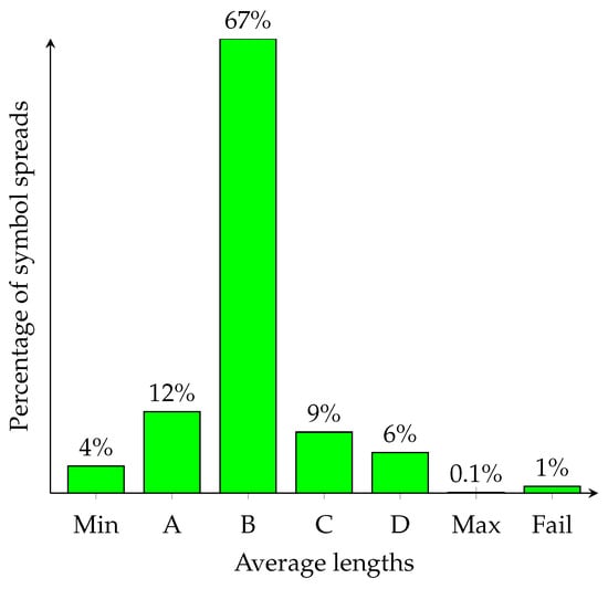 ANS introduced by Duda in [] offers a very versatile compression tool. It allows the compression of symbols that occur with an arbitrary probability distribution (statistics). ANS is also very fast in both hardware and software. Currently, ANS is the preferred compression algorithm in the IT industry. It has been adopted by Facebook, Apple, Google, Dropbox, Microsoft, and Pixar, to name a few main IT companies (for details see https://en.wikipedia.org/wiki/Asymmetric_numeral_systems, accessed on 13 April 2023). ANS can be seen as a finite state machine (FSM) that starts from an initial state, absorbs symbols from an input source one by one and squeezes out binary encodings. The heart of an ANS algorithm is its symbol spread function (or simply symbol spread for short) that assigns FSM states to symbols. The assignment is completely arbitrary as long as each symbol s is assigned a number  of states such that , where  is probability of the symbol s and  is the total number of states (R is a parameter that can be chosen to obtain an acceptable approximation of  by ).