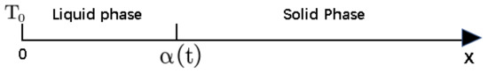 As shown in Figure 1, assume that a semi-infinite solid occupying is in the process of solidification or melting. For any moment , the region consists of a solid and a liquid. The liquid is located in the region, and the solid is located in the region.