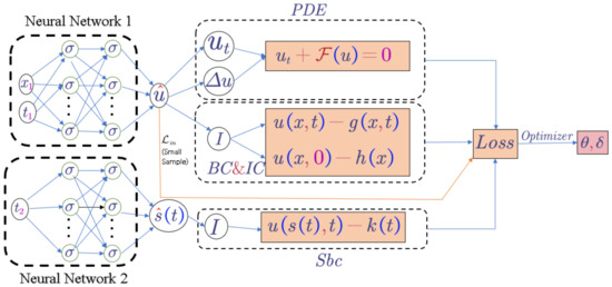 To summarize, our proposed algorithm is displayed in Algorithm 1 and visualized in the schematic diagram in Figure 3, where we explain each step in detail. First, we construct two neural networks and . is the set of weight matrices and bias vectors in u; is the set of weight matrices and bias vectors in ; for the neural networks as a substitute for u and , we can use auto-differentiation and the chain rule to differentiate the functions, then we need to restrict the two neural networks to satisfy the physical conditions imposed by the PDE and Stefan condition, while it is harder to achieve if we constrain over the whole region, so we constrain u and at scattered points and various training sets and measure the difference between the two neural networks and the constraint; we define the loss function as the sum of the hyperbolic cosine logarithms of the equations and the residuals of the boundary conditions (where the derivatives involved are handled automatically by AD), and in the last step, we minimize the total loss function to obtain the optimal parameters and, thus, the optimal solution. Since the loss is nonlinear and nonconvex, we usually use gradient-based optimizers to minimize the loss function, such as gradient descent, Adam [36], and L-BFGS [37].
