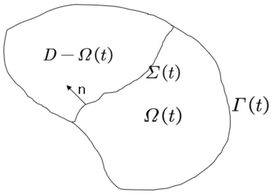 As depicted in Figure 4, let , for any , , be the time-dependent bounded subdomain in D, be its boundary, and , where represents the fixed boundary and represents the moving boundary.