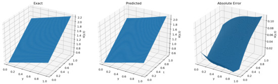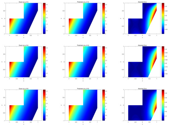 We used the same hyperparameters in the numerical example above and constructed the same loss function in (15), minimizing the loss function by the Adam optimization algorithm to obtain the optimal solution and the free boundary, as shown in Figure 13, where we can see that our proposed method can also achieve good accuracy for complex computational domains. The relative error between the predicted solutions and can reach and . Snapshots of moments for s, s, and s are given. It can be seen that the model predicts the temperature solution and moving boundary, in good agreement with the exact solution.