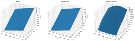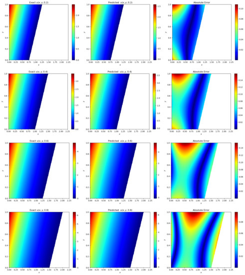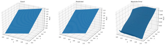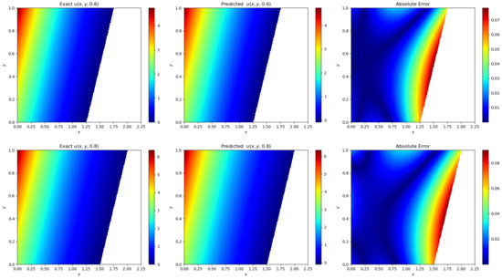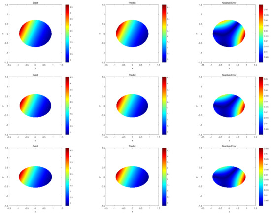 Next, we also used the same loss function construction as in (15) to predict and . We give snapshots of the predictions when s, s, and s in Figure 15. From that, we can see that our proposed neural network framework can also have a good prediction for general irregular moving boundaries; meanwhile, the relative error between the predicted solutions and can reach and .