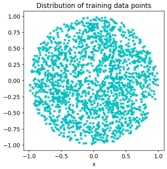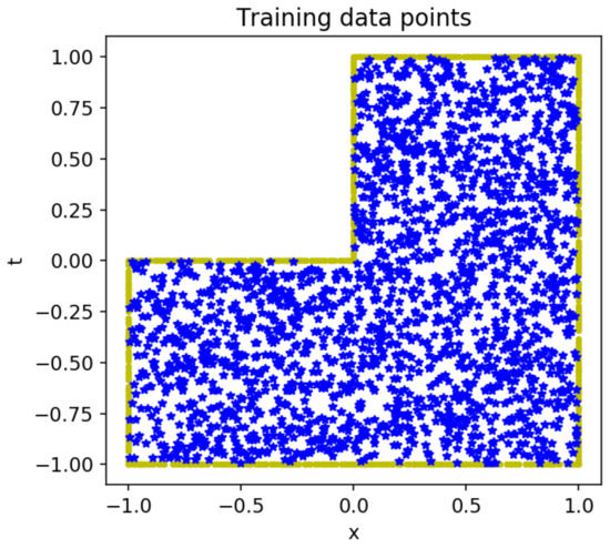 Figure 12 represents the plan view of the selected training points on the L-shaped complex computational domain. Unlike the above example, we randomly selected the training points on the boundary, and after the complex computational domain was triangulated and dissected, the internal points were selected at the nodes instead of selecting random samples as internal information.