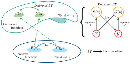 A graphical representation of the Legendre transform and its deformations. (Left:) While the standard Legendre transform acts on concave duals, the deformed one acts between C-concave functions. Each transform brings elements of one space to the other. Please note that while Section 2 presents the classical view of Legendre transforms acting over convex functions, the rest of this work follows Ref. [9] in focusing on concave functions. (Right:) The symmetry that governs the algebraic relationships between convex dual functions and dual coordinates, which is mediated by the Legendre derivative operator , which differs from the standard Euclidean gradient when the transform is deformed.