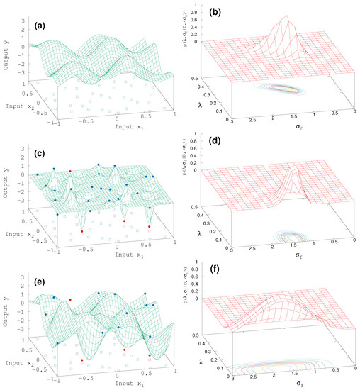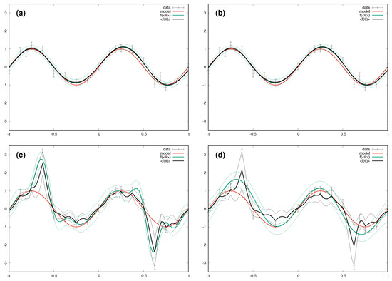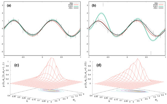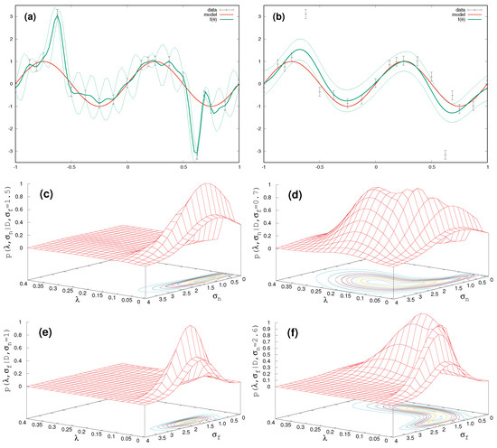Figure 1a,b—only the uncertainty ranges (outer green or black lines) show differences, i.e., the GP method is trying to cover all data within a broader range. However, with two outliers at hand (two data points were raised by just multiplying with a factor of three), the surrogate from the GP method (see