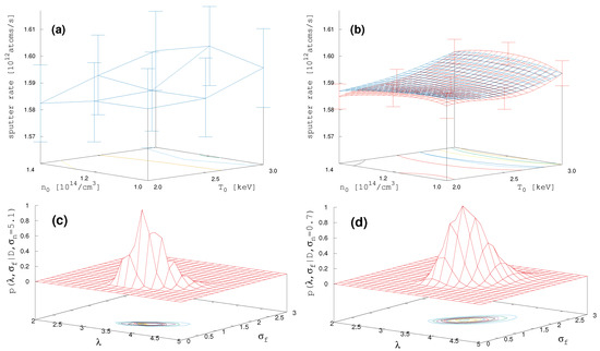 The neighborhood of the two data vectors should be of relevance for the smoothness of the result, which is mimicked by a length scale in the denominator to represent the long-range dependence of the two vectors. Moreover, since the Gaussian process method defines a distribution over functions, the width of this distribution will have some influence on our result as well. This shall be comprised by the signal variance . An element of the covariance matrix of the input data is abbreviated as , and the vector of covariances between the test input vector and a single input data is . Finally, in addition to the above estimation of the variance of a distinct data point with , provided, e.g., by the EIRENE MC-simulations, we consider an overall noise in the data by a variance . Starting with no further information about the hyperparameters, we assume Gaussian priors with (1, 1).