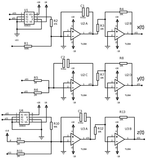 From the system (10), the electronic components are OAs TL084 U2, U3, analog-multipliers AD633 U1, U4, capacitors C1 = C2 = C3 = 10 nF, and the resistors R1 = 500 k, R2 = 47 k, R3 = R4 = R7 = R8 = R12 = R13 = 10 k, R = R5 = R9 = R11 = 1 M, R6 = 2 M, and R10 = 94 k. The bifurcation parameter d was fixed in = +3.8 V, the circuit is powered with = +18 V and = −18 V. Evaluating the proposed electrical components in the system (10), the set of parameters of system (9) are conducted using = 2, = 2.127, = 0.5, and = 1.