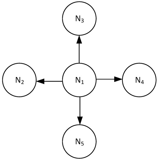 If the control signal in (13) is for , then we have the original set of N uncoupled MACM’s circuits, which evolve according to their own dynamics. We consider, for illustrative purposes, in this work, that , i.e., we have five-coupled MACM’s circuit-like nodes to be synchronized in a star-coupling topology and and a coupling constant k. In particular, we consider a single master node and four slave nodes , and for the physical implementation of this network (12) and (13), the topology of which is shown in Figure 3.