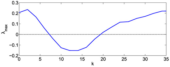 where is the local Jacobian of the vector function evaluated on a (bounded) trajectory , in this case of the master system, with being an eigenvalue of the coupling matrix , with . We calculated the maximum Floquet or Lyapunov exponents for the generic variational Equation (8) as a function of the coupling strengths k, where the synchronous state for is unstable if the synchronous state is stable. For the computational calculation of the , we use the programming software Matlab with initial conditions .
