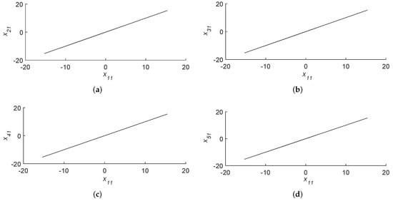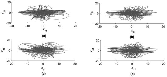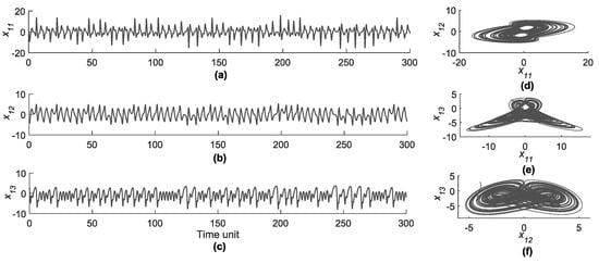 The chaotic synchronization in a star network topology is implemented in MATLAB for numerical results. We use the ODE45 function to integrate the system of differential equations of first order using the explicit formula Runge–Kutta (4,5) []. The control parameters are the same for each MACM system (9), i.e., , , , and , but with different initial conditions for each system presented in Table 1, and the time-series and phase-plane graphics of master MACM system 1 are shown in Figure 5. Thus, all the MACM systems present chaotic behavior.