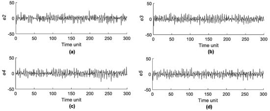Time series of the errors for each MACM system in the star network without coupling: (a) ; (b) ; (c) ; and (d) .