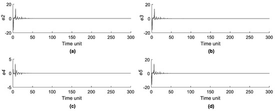- Synchronization of star network. We used a coupling constant of between the master and slave MACM systems; different initial conditions are used for each MACM system (see Table 1); the control parameters are the same in all MACM systems, i.e., , and . After 50 time units (transient time), the star network is synchronized as shown in Figure 16.