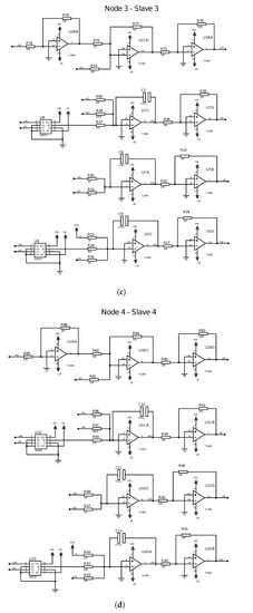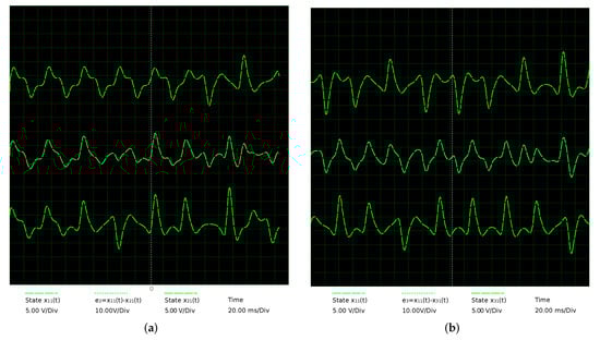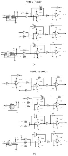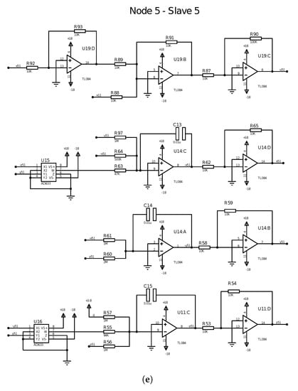 In order to obtain different initial conditions in the electronic simulation of Figure 10, we propose the initial condition settings for each node using electric components with slightly different values; for the slave nodes , , , and , we used the resistors R24, R50, R29, and R55, respectively.