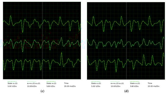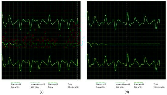 - Switching parameter d of master MACM. The parameter d of the master node is switched between and , for 0 and 1 in the extended plain binary data, respectively. During this time, the absolute synchronization error is determined in , , , and , which are shown in Figure 16a–d with a blue line. Since initial conditions are considerably different at the start communication, the error is bigger in the first time units.
