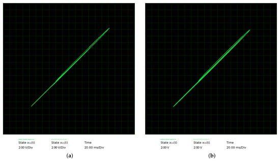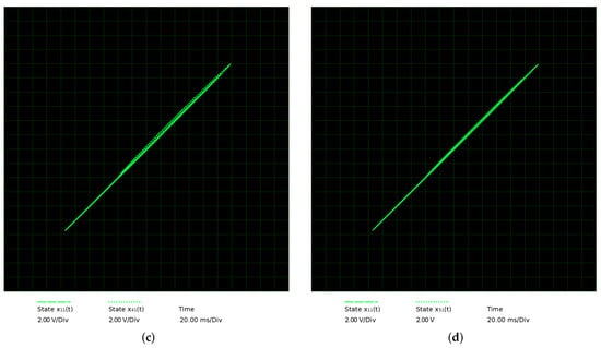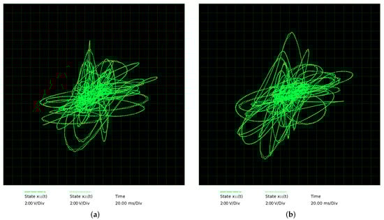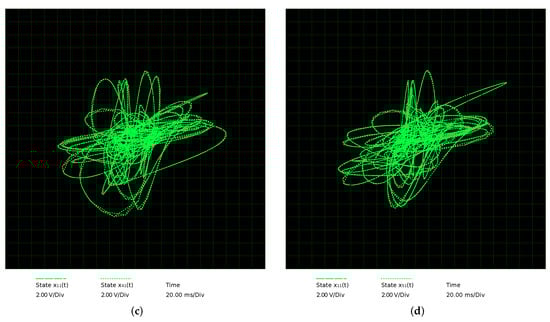 Figure 1 shows the electronic circuit of the MACM system (10), and its circuit simulation is conducted using the Proteus 8 Professional from Labcenter Electronics []. Figure 2 shows temporary trajectories and the phase-planes of the system (10).
