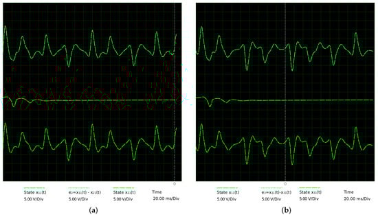 As the state of master versus state of slave is shown in Figure 12, we can see the chaotic nodes and without coupling. The synchronization of the MACM circuits of the Equations (14) and (23) is achieved using the proposed network circuit depicted in Figure 12, the errors are shown in Figure 13, and the phase-planes are shown in Figure 14. For the other three slave nodes , , and , we used the same process given for the synchronization of versus .