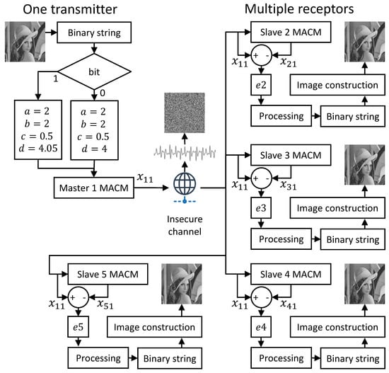 In contrast with chaos-based cryptography which uses permutation and diffusion to encrypt image data to one receptor [,], we present the application of image encryption in a star network to securely transmit a digital image from the master MACM system to four slave MACM systems (multiple receptors) using chaotic synchronization and switching parameter technique [,]. In Figure 15, the schematic of the proposed image encryption process is presented. The process to transmit the digital image is described in the next steps: