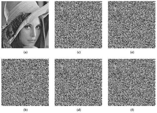 The proposed image encryption process is implemented at the software level in MATLAB (R2015a) in one laptop with a Intel Core 2.9 GHz processor, 8 GB of RAM, and operative system Windows 10 of 64 bits. The results of image encryption and decryption with the coupling constant are presented in Figure 17. Figure 17a shows the plain image of Lena with pixels to be transmitted by the master MACM; Figure 17b shows the cryptogram, which is constructed with the chaotic signal as a noise image; Figure 17c–f present the decrypted image in slaves 1–4, respectively. When the network is not synchronized, the images cannot be recovered in the slaves.