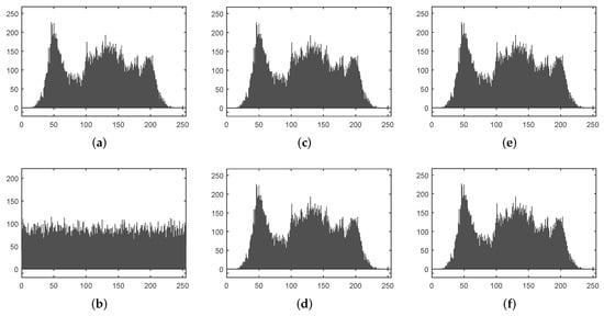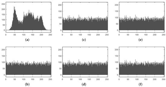 Graphic correlation of images with the coupling constant : (a) plain Lena histogram; (b) cryptogram; (c) correlation in slave 2 MACM; (d) correlation in slave 3 MACM; (e) correlation in slave 4 MACM; (f) correlation in slave 5 MACM.
