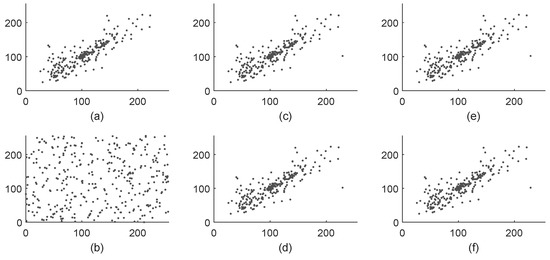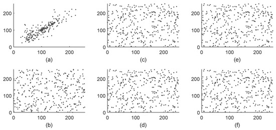 Graphic correlation of images with coupling constant : (a) plain Lena histogram; (b) correlation of cryptogram; (c) correlation in slave 2 MACM; (d) correlation in slave 3 MACM; (e) correlation in slave 4 MACM; (f) correlation in slave 5 MACM.