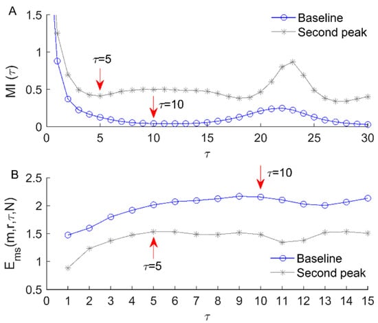 Illustration of the relationship between delay and entropy for SBF signals. (A) Examples of mutual information function of a SBF signal during the baseline and second peak periods. The values of determined as the first minima of for the two signal epochs are 10 and 5, respectively. (B) increases initially with increasing values of and when takes a value around that determined as the first minimum of .