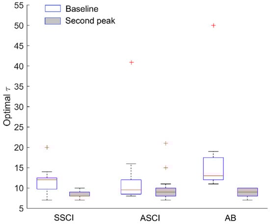 The performance of has been systematically tested using simulated time series and SBF data [,]. The testing results showed that is able to reflect changes in structural properties of SBF oscillations and shows relative consistency. Moreover, if time delay in data points takes the value determined by the first minimum of , is almost independent of the sampling rate [,,]. We computed for each SBF signal epoch. The parameters = 2 and = 0.2 × SD, where SD is the standard deviation of the signal epoch, were used according to previous studies [,,,,]. As for the parameter , we first computed its optimal value for each signal epoch and then selected an upper limit according to the distribution of the optimal values for all signal epochs. As shown in Figure 2, for the SBF signals during the baseline period, the medians of the optimal values of in three groups ranging from 10 to 13, while for the signals during the second period, the median of the optimal values is approximately 7. Therefore, we selected 15 as the upper limit of the values. The same value of was used when comparing among three groups.
