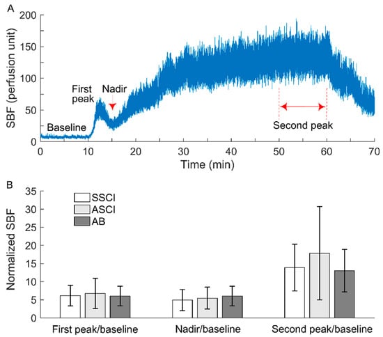 (A) A typical SBF response to local heating. (B) Biphasic thermal index (ratios of the first peak, nadir, and second peak to baseline) in three groups. The results are presented as the mean ± standard deviation. The differences in three ratios between three groups were examined using one-way ANOVA and the t test but no significant difference was observed.