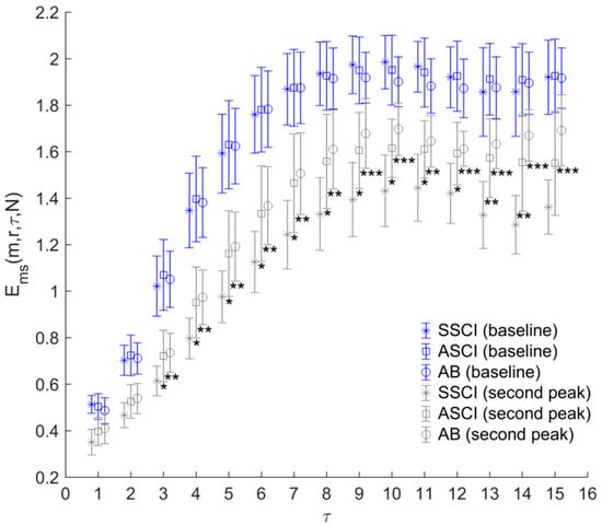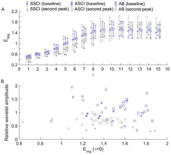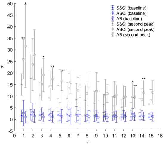 Figure 5 shows the statistical results of (Equation (4)). In all groups, was significantly larger during the second peak compared to the baseline. For the between-group comparisons, only during the second peak period, significant differences in were observed. Compared to SSCI group, in the ASCI and AB groups was significantly larger for several values of .