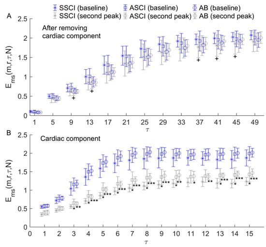 (A) Comparisons of of SBF signals after removing the cardiac component between the baseline and second peak periods and between three groups. Only the results for = 1, 5, …, 49 are shown and presented as the mean ± standard deviation. Compared to the baseline period, was significantly lower during the second peak period for from 34 to 45 in the SSCI group and for from 6 to 16 in the ASCI group. +, p < 0.05 (paired t-test). (B) Comparisons of of the cardiac component between the baseline and second peak periods and between three groups.