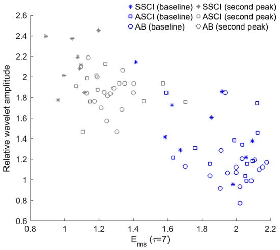 To further investigate the underlying mechanisms responsible for the distinct differences in regularity degree of BFOs between three groups, we performed wavelet analysis of the SBF signals. After implementing continuous wavelet transform, we calculated the relative amplitudes () of five characteristic frequency components, i.e., metabolic, neurogenic, myogenic, respiratory, and cardiac components. This measure was defined as the ratio of averaged amplitude of a specific frequency component over time to averaged amplitude of all frequency components over time [], aiming to quantify the relative activity levels of the regulatory mechanisms of SBF. The results showed that in all groups, of the cardiac component and of the myogenic component significantly increased and reduced, respectively, from the baseline period to second peak period. During the second peak period, of the cardiac component in the ASCI group was similar to that in the AB group and significantly lower than in the SSCI group, while of the myogenic component in the ASCI group was slightly lower than in the AB group but significantly higher than in the SSCI group. The above results indicated that during the second peak period, the cardiac component in ASCI and AB subjects differed distinctly from that in SSCI subjects not only in but also in . However, we argue that there is no association between and because they quantify the structural and magnitude features of BFOs, respectively. As shown in Figure 7, during the second peak period, values of of cardiac oscillations in SSCI and AB subjects were almost linearly separable, i.e., only the largest value for SSCI subjects was larger than the smallest value for AB subjects, whereas values for the two groups were linearly inseparable although the difference between two groups reached a significant level. Another case in point was that during the second peak period, of myogenic oscillations was significantly lower in the SSCI group than in the AB group but no significant difference existed in between the two groups (Figure 8).