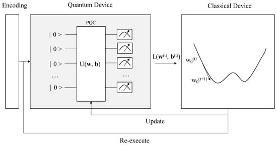 Figure 2 shows the typical workflow when running a PQC. The first step randomly initializes the QNN weights w and biases b. These are parameters characterizing a gate in the PQC. For instance, the angle of a rotation gate can be a QNN parameter, e.g., a QNN weight. Then for each training sample, we first encode the input data (an image, for instance) into a quantum state using an encoding layer; we then execute the measure of the PQC results with current w and b (this corresponds to apply a unitary circuit to the encoded sample as in ). The norm of the difference between the measurement and training sample label will provide the loss function. For instance, a loss function is calculated using the PQC measurement and label data ():