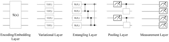 - Encoding/Embedding Layers. These layers are used to encode classical data into quantum Hilbert space. Basically, the encoding process is equivalent to a feature map that assigns data to quantum states [58,59]. Inner products of such data-encoding quantum states give rise to quantum kernels. These feature maps are used in QNNs as a way to perform nonlinear transformations, akin to activation functions in NN, on the input data.Common feature maps used in the QNNs are amplitude, angle, basis, and Hamiltonian encodings. Amplitude and angle encodings map classical data to the amplitudes and phases of a quantum state, respectively. Basis embedding encodes the binary feature vector into a basis state. Hamiltonian encoding associates a system’s Hamiltonian with a matrix representing the data transformation. An example of Hamiltonian encoding is using a quantum circuit with single-qubit rotations to encode the input data. This encoding using multiple quantum rotation gates, for instance, allows us to express quantum models as Fourier-type sums [60]. In CV QNNs, the most used encoding is displacement embedding, which encodes features into the displacement of qumodes amplitudes or phases.Encoding layers are critical for developing QNN as the data-encoding strategy largely defines the QNN expressivity, e.g., the features QNN can represent [59,61]. Feature maps are critical building blocks for developing scientific quantum machine learning and Differentiable Quantum Circuit (DQC) [62,63,64].