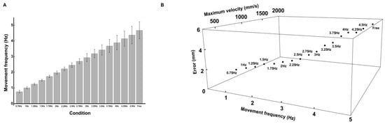The relationship between the average maximum velocity and error from the target center point for each condition (Figure 3B): The results show that from 0.75 Hz to approximately 3 Hz, the error increases only slightly with increasing velocity; subsequently, the error increases with increasing velocity.