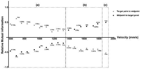 The gray circles show the relative mutual information moving from the target point to the midpoint for each condition (Figure 5). The trend for the frequency condition changed from positive to negative at approximately 3 Hz and 3.25 Hz. A negative proportional relationship was observed between the velocity and amount of mutual information. The black circles show relative mutual information moving from the midpoint to the target point for each condition (Figure 5). Similarly, the frequency condition trend changed from negative to positive at approximately 3 Hz and 3.25 Hz. A positive proportional relationship was observed between the velocity and amount of mutual information. The absolute values were higher under low-frequency (low velocity) and high-frequency (high velocity) conditions. The values approached zero and were lowest in the frequency range, where the positive and negative values switched. In the free condition, the two points had similar entropy values (Figure 4) and large absolute values of mutual information (Figure 5).