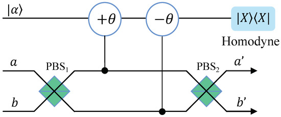 The schematic diagram of the PCM gate [43]. PBS: polarization beam splitter; a and b: the input routes; and : the output routes. Photons passing through the up (down) route will cause a phase shift () on the probe coherent beam under the nonlinearity. Odd-parity and even-parity can be distinguished according to the result of homodyne measurement.