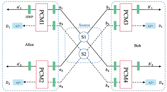 The schematic diagram of the entanglement purification of the logic phase-flip error is shown in Figure 3. The difference with the purified bit-flip error is that photons do not need to pass through the HWPs before entering the PCMs. Before purification, Alice and Bob share two copies of mixed states in Equation (16) from source S, denoted as . It is in the state , , , and with probability , , , and , respectively. The photons of state and are in spatial modes and , respectively.