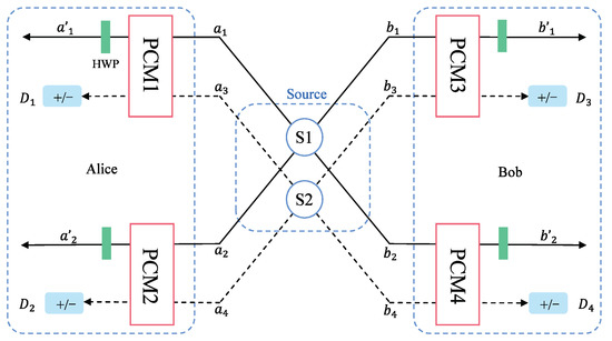 As shown in Figure 3, photons sent to Alice in spatial modes and pass through PCM1 and PCM2 gates, respectively, and photons belonging to Bob in spatial modes and pass through PCM3 and PCM4 gates, respectively. According to the results of polarization parity check measurement, and can be distinguished from and (see in Table 3).